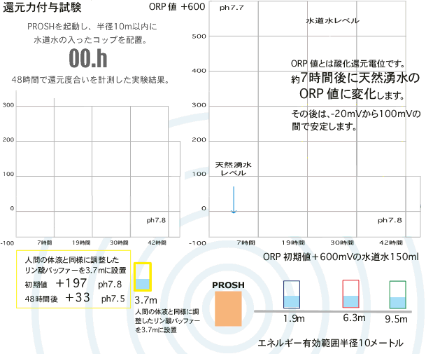 酸化還元電位がプラス600mV程度の一般的な水道水を、わずか数時間で、マイナス100mVという深山幽谷の湧き水にも匹敵する水に変える還元力をe-blessは発揮します。